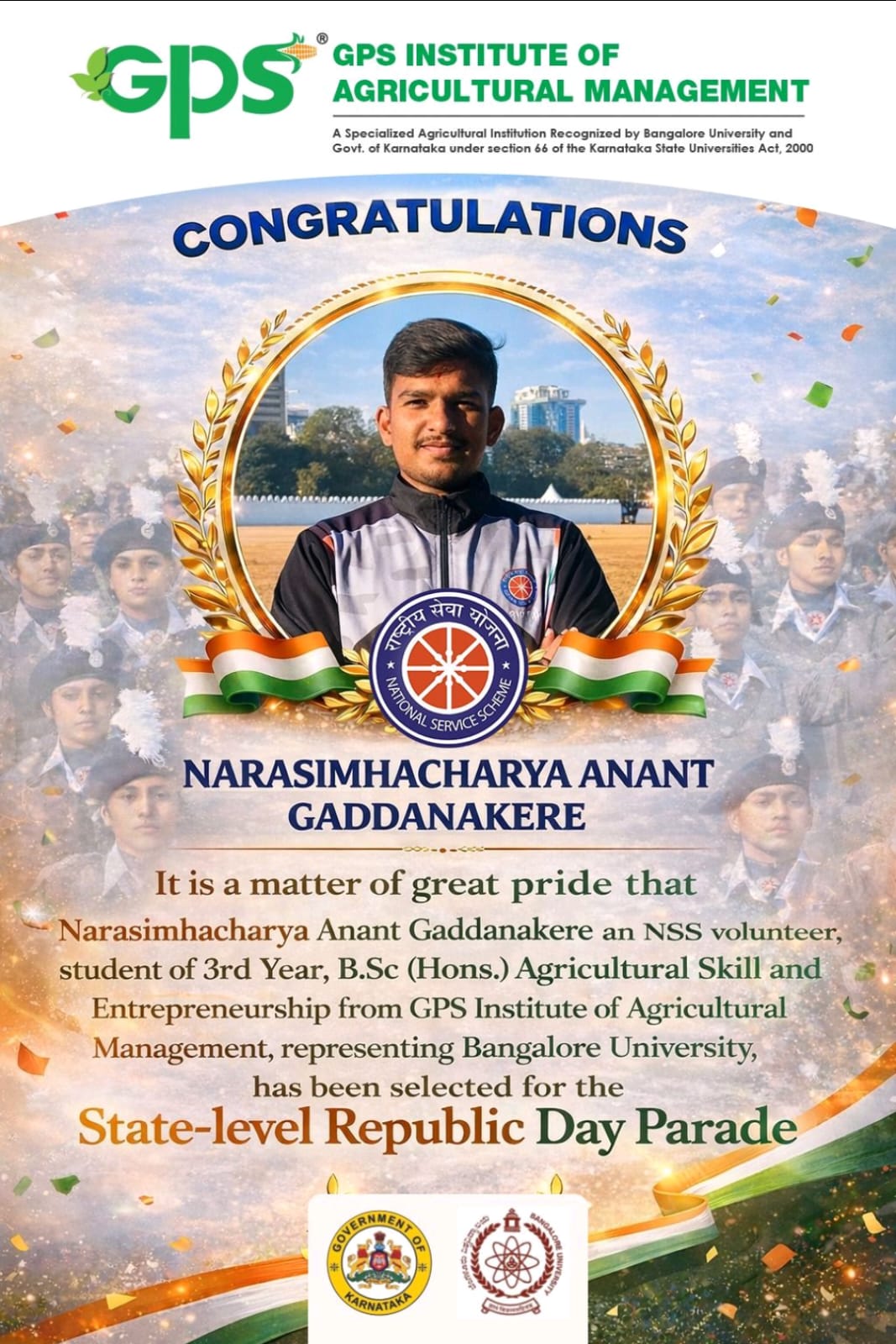 We are delighted to announce that, achievement by Mr. NARSIMHACHARYA ANANT GADDANAKERI, an NSS volunteer, Studying in 3rd Year, B.Sc (Hons.) Agricultural Skill and Entrepreneurship, who represented our institution under Bangalore university in "STATE REPUBLIC DAY PARADE 2026" and also awarded with first prize for outstanding performance in the parade.