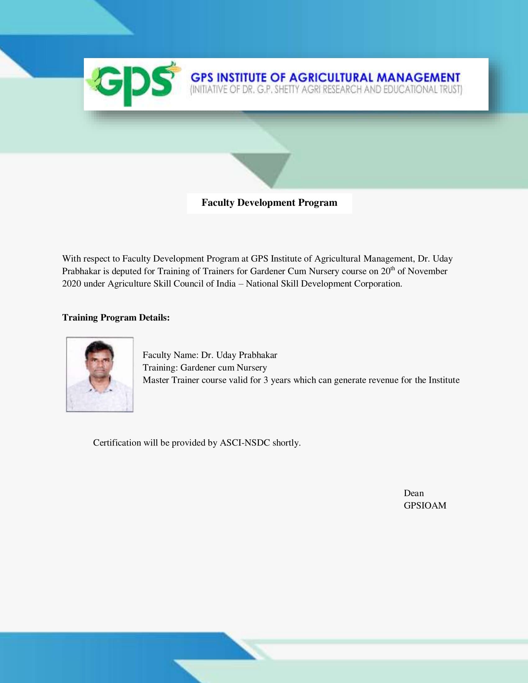 The GPS Institute of Agricultural Management is established under the aegis of Dr.G.P. Shetty Agri Research and Education Trust, and named after him, a great visionary in agriculture from Karnataka. The institute has PG Diploma/Diploma in Agricultural Management and ASCI-NSDC affiliated programmes for the benefit of Agricultural and allied science graduates to enhance and elevate their skills, knowledge and competencies in applied aspects of agricultural technologies, agribusiness, and transfer of technologies and entrepreneurship so as to empower them in choosing their career path. Since most of the students hail from rural areas with poor socio-economic background, the institute facilitates bank loans. It also assures merit-based placement to all students.
